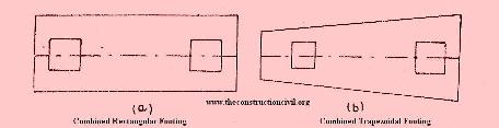 Combined footings are constructed in a way that the centre of gravity of the supporting area coincides the line of centre of gravity of the two column loads. These are usually in the form of rectangular or trapezodial in shape. Rectangular shape is adopted where loading condition is such that either the two columns are equally loaded or the interior column carries greater load. On the other hand, in case of trapezodial footing, no such condition is applicable.