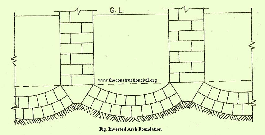 Inverted Arch Footing/Foundation is used to be provided for multi-storeyed buildings in olden times. However, with the advent of reinforced cement concrete construction practice, inverted arch foooting is rarely done these days. One of the drawbacks in this type of construction is that the end piles have to be specially strengthened by buttresses to avoid the arch thrust tending to rapture the pier junction. However, the advantage of inverted arch construction is that in soft soils the depth of foundation is greatly reduced. Inverted arch footing has been illustrated below.