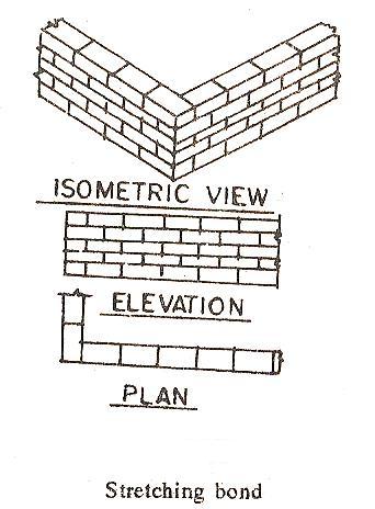 In this arrangement of bonding, all the bricks are laid as stretchers. The overlap, which is usually of half brick, is obtained by commencing each alternate course with a half brick bat. Stretching bond is used for half brick wall only. This bond is also termed as running bond and is commonly adopted in the construction of half brick thick leaves of cavity walls, partition walls, etc. Since there are no headers, suitable reinforcement should be used for structural bond.