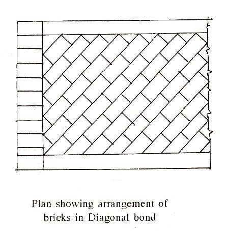 (b) Diagonal bond. This bond is best suited for walls which are 2 to 4 brick thick. This bond is usually introduced at every fifth or seventh course along the height of the wall. In this bond, the bricks arc placed end to end in such a way that extreme corners of the series remain in contact with the stretchers.