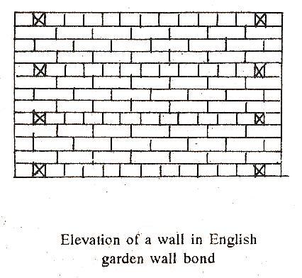 (a) English garden wall bond. The general arrangement of bricks in this type of bonding is similar to that of English bond except that the heading courses are only inserted at every fourth or sixth course. Usually the arrangement consists of one course of headers to three courses of stretchers. A queen closer is placed next to the quoin header of the heading course to give the necessary lap.